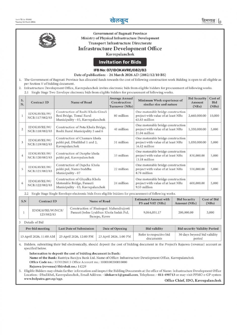 ठेक्का आव्हानको सुचना (पून: आह्वान IDOKAVRE/W/NCB/90,91,94,112/082/83) र (IDOKAVRE/W/NCB/113-116/082/83)