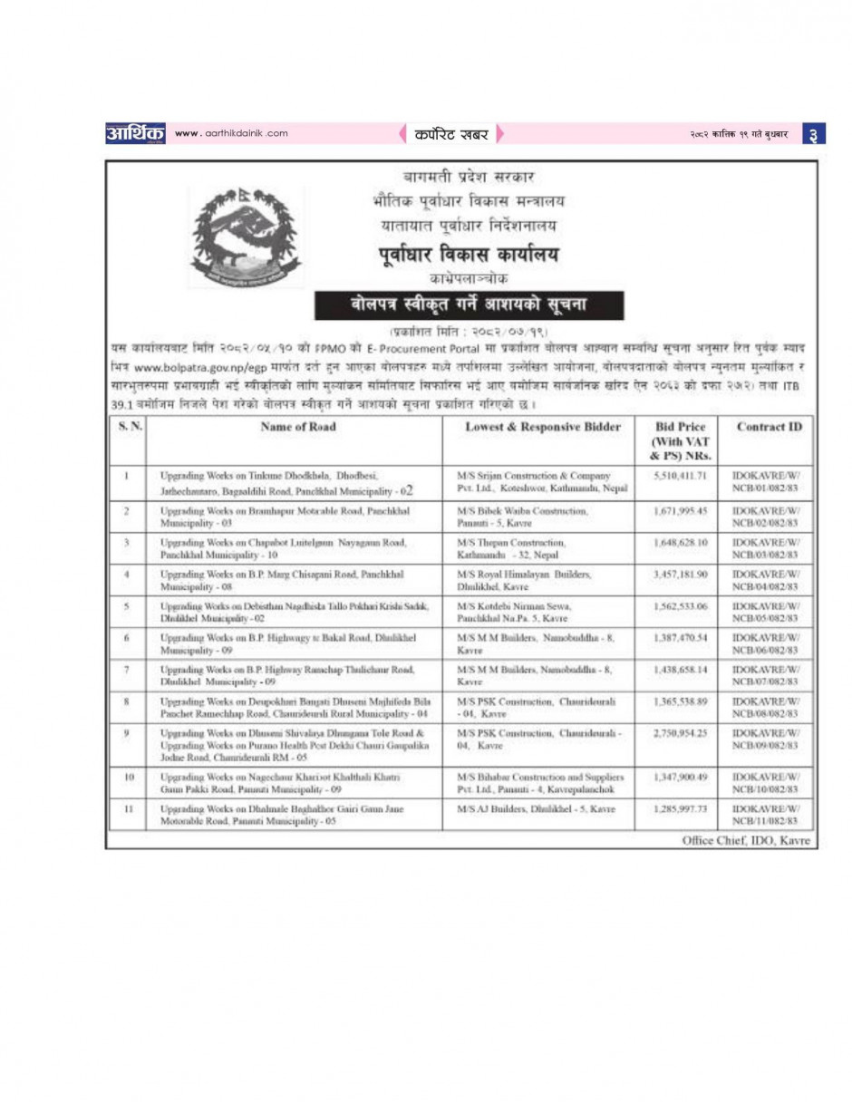 वोलपत्र स्विकृत गर्ने आशयको सूचना (01-11/IDOKAVRE/082/83)