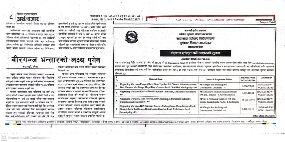वोलपत्र स्विकृत गर्ने आशयको सूचना (IDOKAVRE/W/NCB/12-52/082/83)