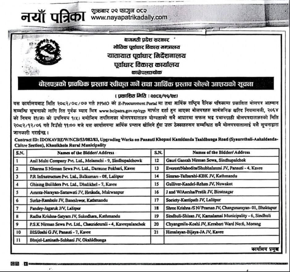 वोलपत्रको प्रावधिक प्रस्ताव स्वीकृत गर्ने तथा आर्थिक वोलपत्र खोल्ने आशयको सूचना (IDOKAVRE/W/NCB/53/082/83)